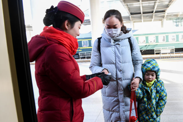 1月31日,杜瑶(左)在站台上检票迎接旅客。
