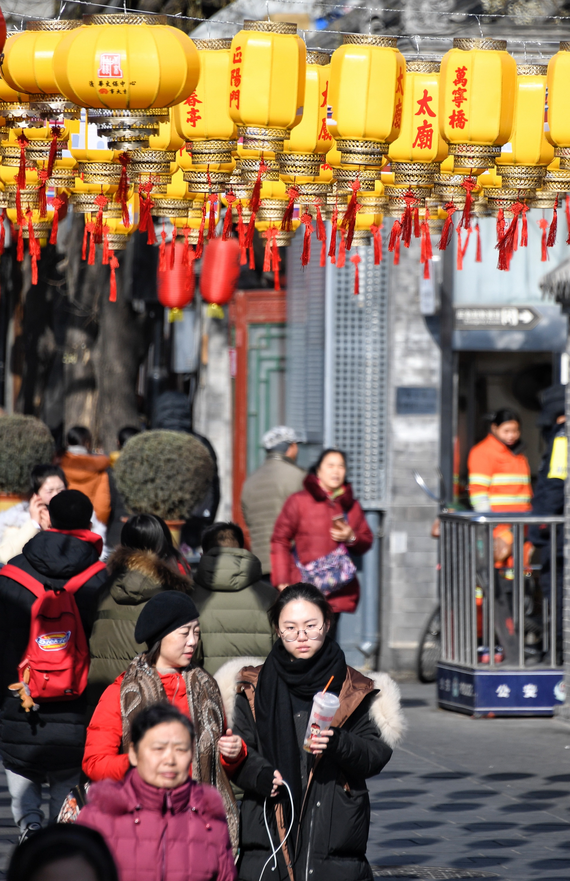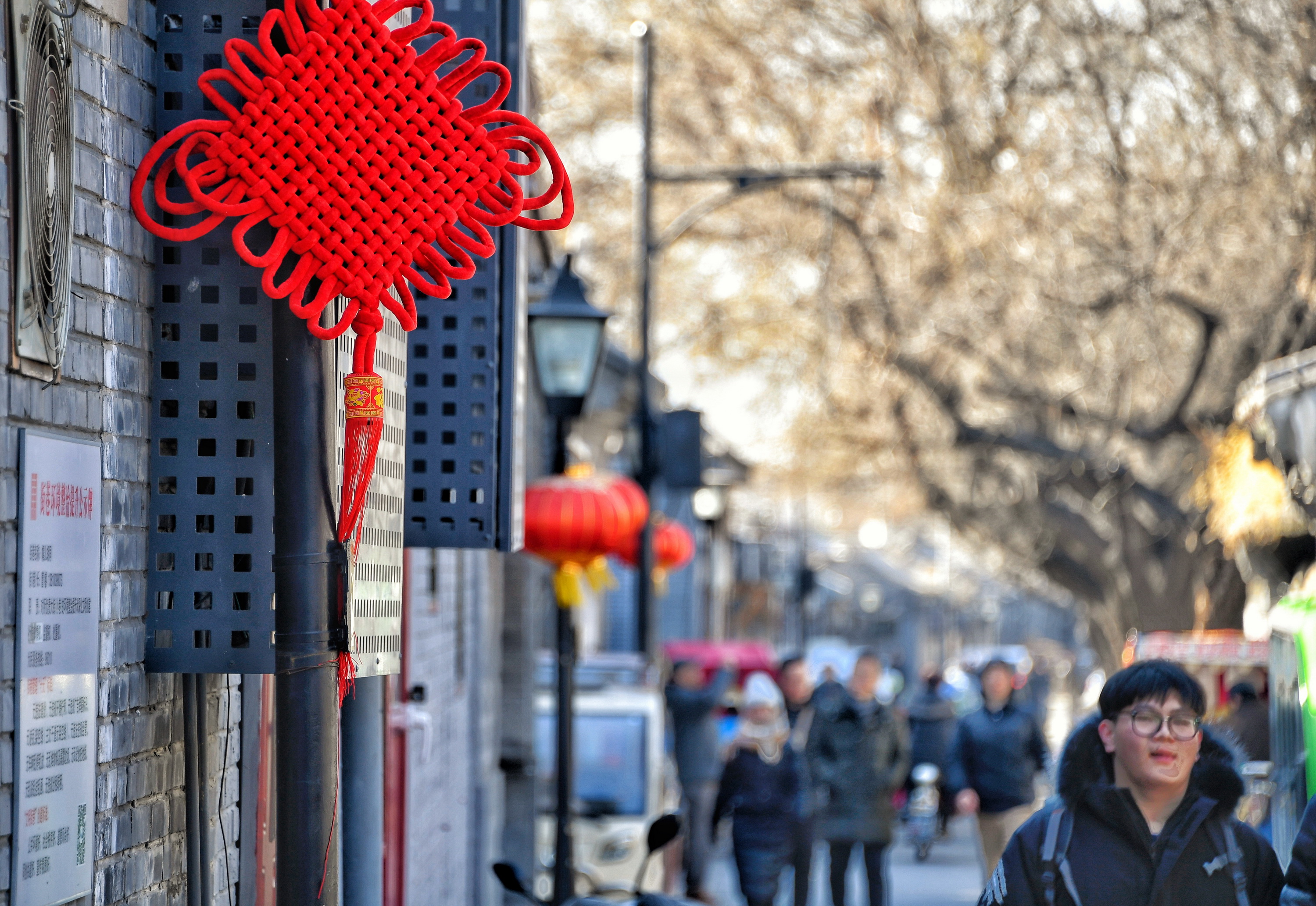 春节即将来临,北京市大街小巷悬挂起灯笼、中国结等,节日气氛渐浓。