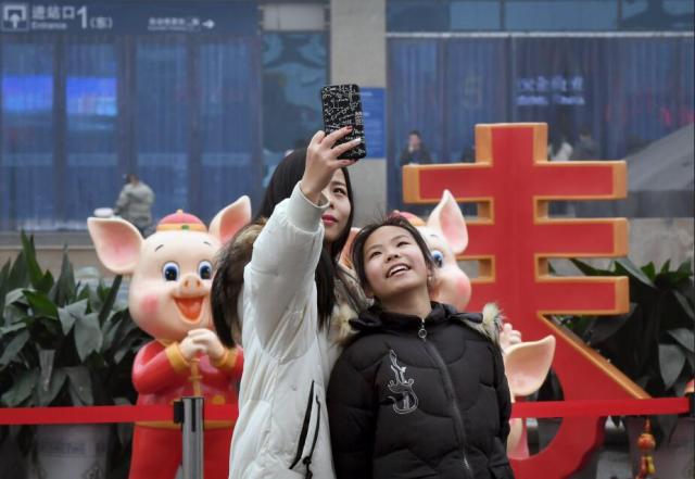 2019年1月30日,在郑州火车站东广场,旅客在一处春节景观前自拍。新华社记者李安摄