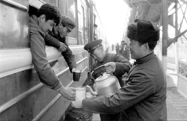 1984年春节期间,在石家庄火车站,工作人员为过往旅客送开水。新华社记者赵连升摄