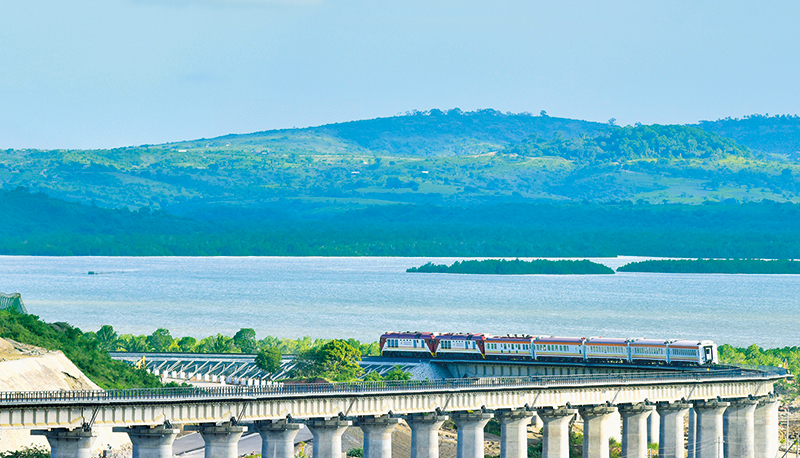 由中国承建的蒙巴萨-内罗毕标轨铁路(蒙内铁路)全长约480公里,于2017年5月通车。图为2017年5月29日,一列肯尼亚蒙内铁路测试列车行驶在蒙巴萨特大桥上。 新华社记者 孙瑞博/摄