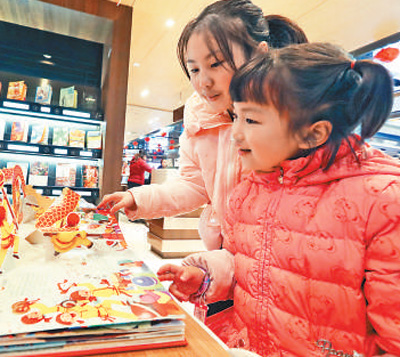 1月28日,重庆沙坪坝书城,小朋友在看年俗立体书。