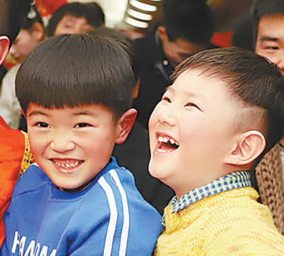 2月1日,在南昌开往北京西的直达列车上,小旅客被“列车春晚”逗乐。