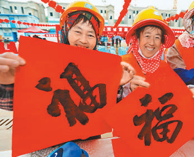 由云南省建设工会和中建二局西南分公司举办的云南省首届工地庙会节上,外来务工人员拿着志愿者刚写好的“福”字,脸上笑开了花。