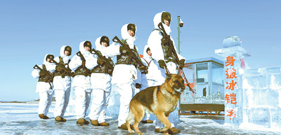 1月31日,北部战区陆军某边防旅“黑河好八连”官兵在界江“5号哨位”的冰哨前执勤。