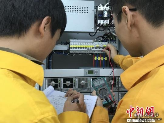 湛江西通信工区的90后小伙子们在测量高开电源数据 孙思媛 摄