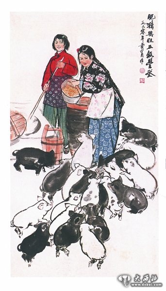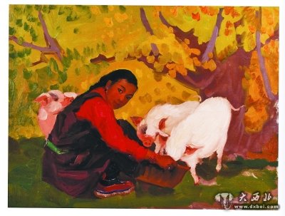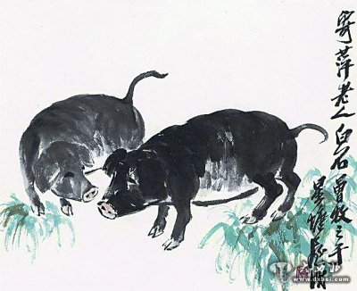 进入20世纪,猪开始成为画家们笔端的常客。齐白石晚年就经常描绘自己儿时在故乡星塘老屋外牧猪的景象。像他这样以亲身经历来画猪的画家恐不多见,因此其笔下的猪总是天趣盎然、栩栩如生,延续了传统绘画中的自然趣味。同样的趣味,我们在后来董希文绘于1961年藏区写生时期的油画《小白猪》里也可以感受到。画中正在喂猪的藏族小女孩与小白猪和谐相处,平淡而天真。