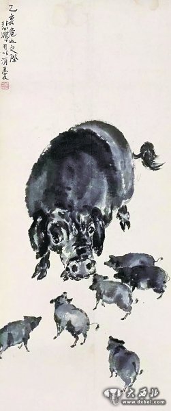 1935年是农历乙亥猪年。面对纷乱的时局,徐悲鸿画下了一幅《猪》以消忧。他以遒劲湿润的大笔触描绘了一只大母猪和六只小猪相互顾盼的景象,画作左上角题款曰"乙亥危亡之际",显露出画家救亡图存的爱国主义精神。除此以外,徐悲鸿还创作过不少猪画。这些画中的猪,不仅展现出画家高超的写实技巧,更传递出他浓浓的家国情怀。
