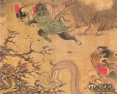 宋画中的猪较为罕见。除了《搜山图》这样表现神怪题材的作品以外,在北宋张择端的《清明上河图》中我们也可看到猪的身影。画面中,七只肥猪正沿着城门外长满柳树的护城河岸缓缓走来。尽管这些猪在画中的位置较偏,但画家还是仔细地描绘了每头猪的鬃毛,并着力刻画出它们拱地觅食的动态。不过,猪的主人似乎并未出现,只有对面的妇人紧紧抱住自己的孩子,生怕受到惊吓。作为描绘市井风情的杰作,《清明上河图》中的这个细节,显示出北宋时依然存在牧放家猪的风俗。在南宋何筌所作的《草堂客话图》中,一个牧童正在院外的溪岸边牧猪,呈现出不同于《清明上河图》的田园风光。尽管画家只是以剪影的方式表现了两只小猪的形态,没有刻画太多细节,但已形神兼备,为恬静安详的画面增添了一丝生趣。