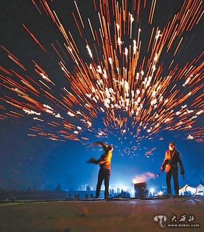 2月1日,河南武陟县嘉应观景区举行"打铁花"迎新春活动,民间艺人将生铁块烧到一定熔度后,用木板将铁块打上天空,形成"铁花火雨"景象,营造出浓浓的节日氛围。