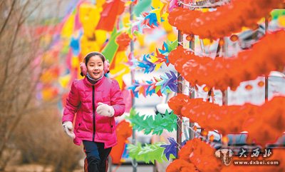 春节将至,内蒙古呼和浩特市玉泉区的广场、公园处处洋溢着红红火火的年味。图为2日,小朋友在玉泉区通顺大巷的彩灯墙旁游玩。