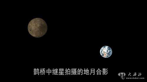 对了,我们还有一个伙伴--中继星。它虽然不在月球上,但是一直帮助我们和地面联系,没有它,我俩就没办法工作。这是它拍到的地球和月球的合影,是不是很美!