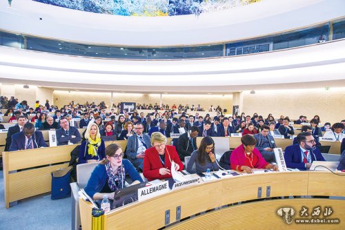 2018年3月23日,在瑞士举行联合国人权理事会第37届会议。会议通过中国提出的"在人权领域促进合作共赢"决议,第一次同时把推进构建人类命运共同体,推进构建相互尊重、公平正义、合作共赢的新型国际关系写入联合国的文件。这是继2017年3月17日构建人类命运共同体理念首次载入联合国安理会决议后,中国理念回声再起,体现了这一理念已经得到广大会员国的普遍认同。图为会议现场。 新华社记者 徐金泉/摄