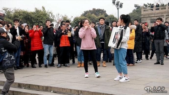 《洪湖水浪打浪》,竹笛清脆悦耳的旋律,响彻黄鹤楼,将人们的视线从地面拉升至楼宇。弦弦演绎的琵琶声,将《龙船调》的风韵向人群抛洒。竹笛琵琶和鸣,把一曲曲湖北风情的音乐流淌,激起现场游客浓浓的家国情怀。