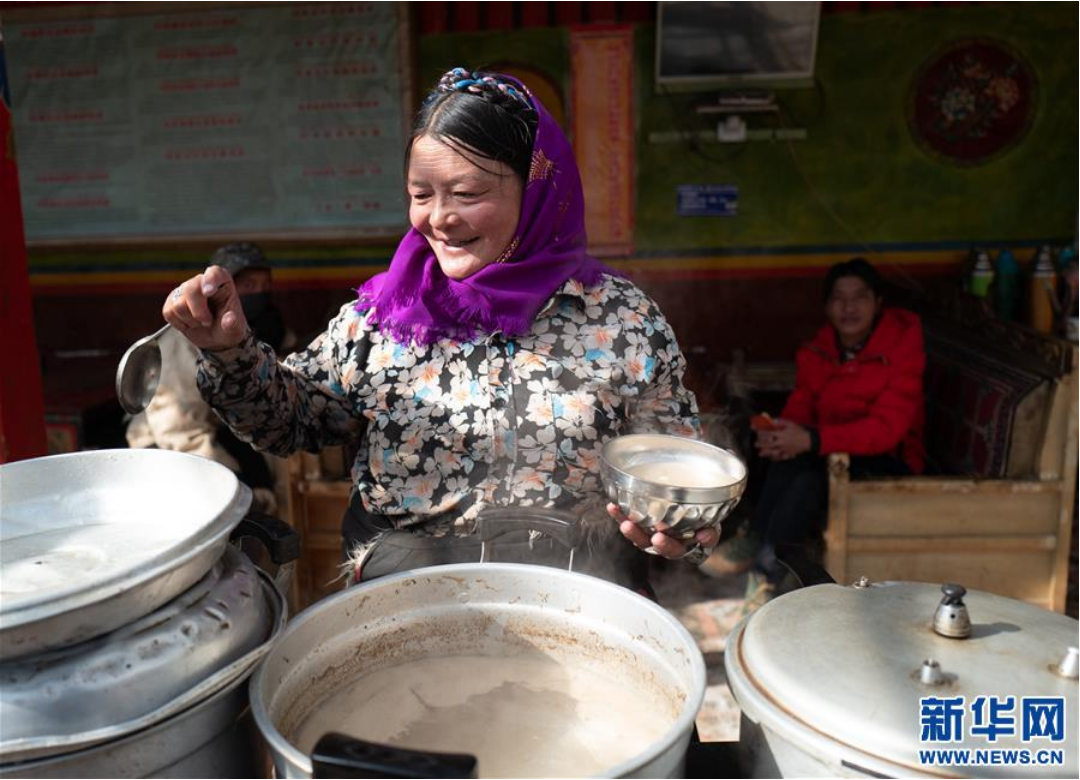 双湖县嘎措乡牧民贡桑曲珍在餐馆里为客人盛饭(1月31日摄)。新华社记者普布扎西摄