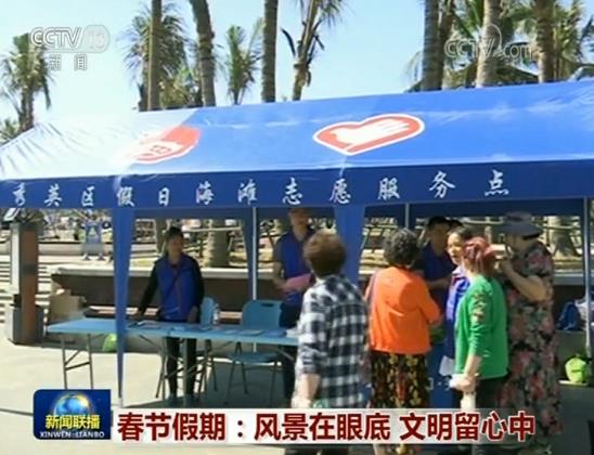 在海南,景区随处可见文明旅游提示标语,来自社会各界的志愿者引导游客,虽然前来旅游的游客爆满,但是现场秩序井然。