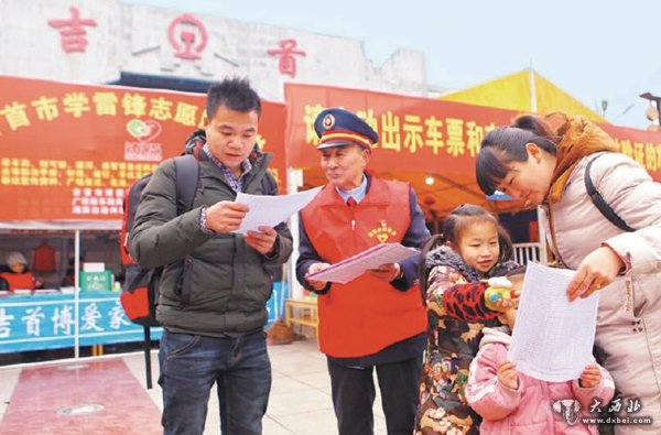 今年78岁的王源孝(左二)是广铁集团张家界车务段吉首火车站退休职工,现为张家界车务段退管党支部书记。2001年退休以后,他带领老年志愿者服务队,连续18个春运坚守在吉首火车站广场,为旅客做好事2万余件,获得奖项达150多项。他把获得的奖金全部用于慈善事业。图为2月9日,王源孝为旅客提供列车时刻信息服务。姚博然摄(中经视觉)