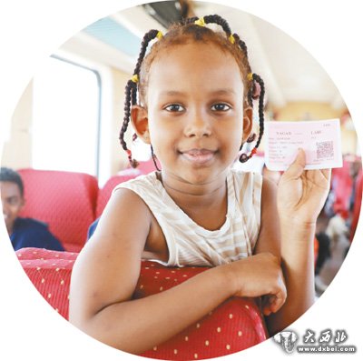 由中资企业承建的亚吉铁路,是非洲第一条跨国标准轨电气化铁路。图为列车上的小乘客向记者展示车票。