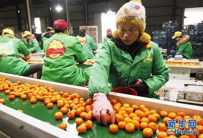 2月11日,江西省南丰县一家果业公司的工人在流水线上忙碌。