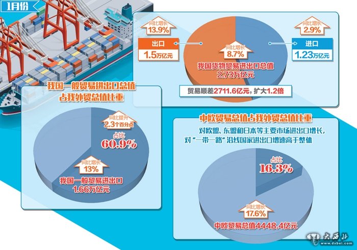据统计,1月份中欧贸易总值4448.4亿元,增长17.6%,占我国外贸总值的16.3%。我国与东盟贸易总值为3566亿元,增长7.8%,其中对东盟出口增长了17.6%;同期,我国对“一带一路”相关国家合计进出口7708亿元,增长11.5%,高出全国整体增速2.8个百分点,外贸占比接近三成。