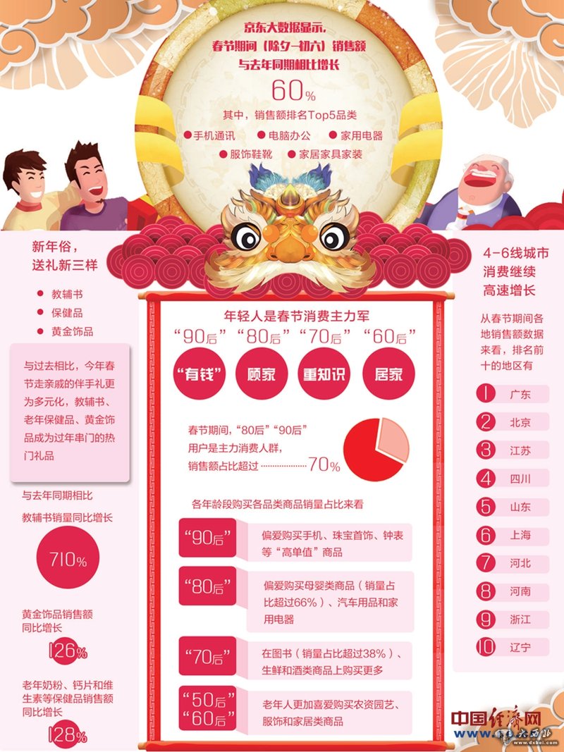 从过去囤萝卜白菜、米面粮油、衣服鞋袜,到跳出“吃穿”的束缚,随时随地享受各种各样的特色商品,这背后是广大人民对美好生活的不懈追求与不断创造。随着老百姓的荷包越来越鼓,消费品位越来越高、消费欲望越来越强。国民消费能力的快速提升,在春节期间体现得尤为明显,而优质的电商平台以丰富的商品、便捷的服务,为广大消费者带来优质的商品与贴心的服务,则是中国经济水平提升、消费不断提质升级的鲜明体现。(本文来源:经济日报作者:京东大数据研究院经济日报社中国经济趋势研究院执笔:孙世芳刘晖王臻刘亚男)