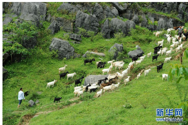 家住贵州省沿河县中寨镇三会溪村村民杨胜强(左)在山上放羊(2018年5月17日摄)。新华社记者杨文斌摄