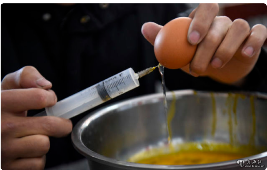 2月13日,宁夏石嘴山市惠农区南街道矿中社区的学生们在学习蛋雕,这是雕刻前抽取蛋液。新华社发(冯开华摄)