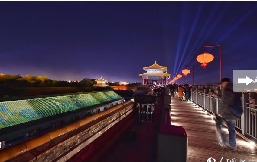当晚,观众可以漫步宫墙上观灯,欣赏投影在金色琉璃瓦上的《千里江山图》等绘画作品。