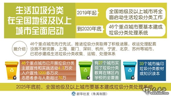 新华社上海2月21日电(记者王优玲、杜康)2019年起全国地级及以上城市将全面启动生活垃圾分类工作,到2020年底,46个重点城市要基本建成垃圾分类处理系统。