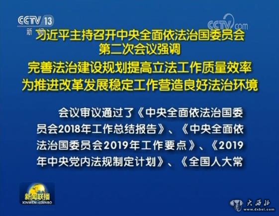 会议审议通过了《中央全面依法治国委员会2018年工作总结报告》《中央全面依法治国委员会2019年工作要点》《2019年中央党内法规制定计划》《全国人大常委会2019年立法工作计划》《国务院2019年立法工作计划》《关于开展法治政府建设示范创建活动的意见》《关于全面推进海南法治建设、支持海南全面深化改革开放的意见》《重大行政决策程序暂行条例(草案)》等文件稿。