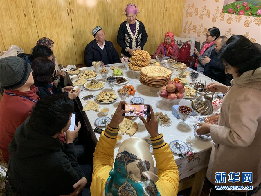 东盟媒体团在吾库萨克镇阿布都热合曼·依明的安居富民房采访做客(2月26日摄)。新华社记者周晔摄