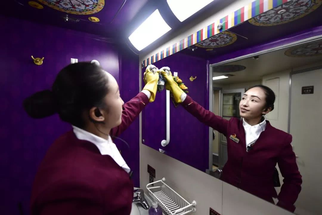 1月21日,旦增央金在擦拭旅客车厢洗漱台镜子。