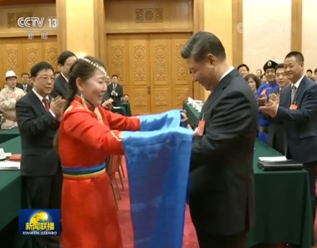 当习近平走进会场时,全场起立热烈鼓掌。鄂温克族代表向习近平献上蓝色的哈达,表达内蒙古各族群众对党中央和总书记的敬意。习近平向他们表示感谢,并请他们转达对各族干部群众的诚挚问候。