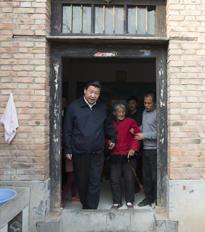 2014年3月17日,习近平在河南省兰考县东坝头乡张庄村看望85岁老人张景枝。