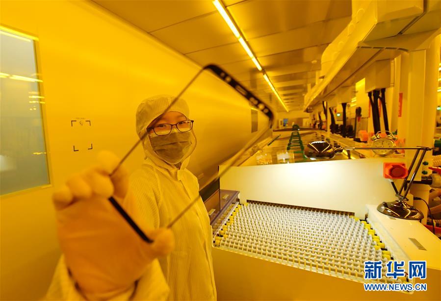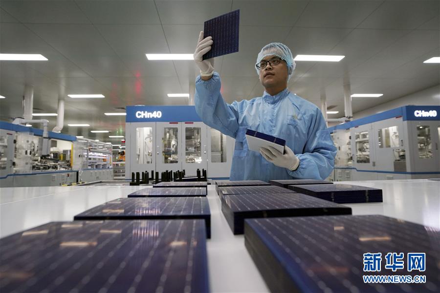 英利能源(江西)有限公司员工在检测光伏电池片(2018年12月11日摄)。新华社记者 宋振平 摄