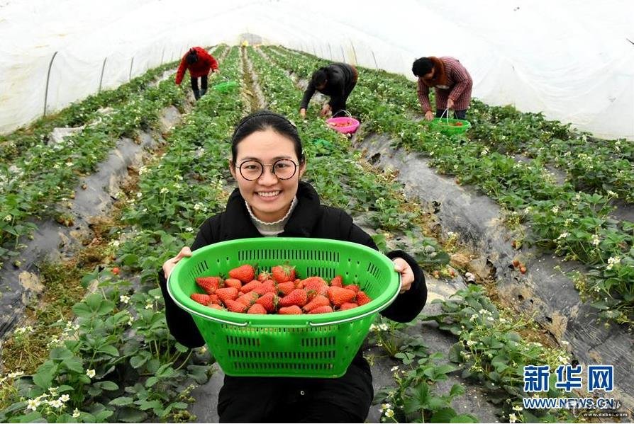 2018年2月27日,王萌萌展示刚采摘的草莓。全国人大代表王萌萌是安徽省定远县西孔村一名大学生“村官”,她带领村民建立起草莓园、蔬菜园、育秧工厂等特色项目,吸引游客前来采摘,村民的日子越过越红火。新华社发(冯再雷摄)