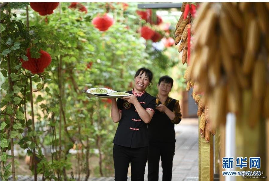 在宁夏固原市西吉县吉强镇龙王坝村,农家饭餐厅服务员在上菜(2018年8月30日摄)。新华社记者王鹏摄