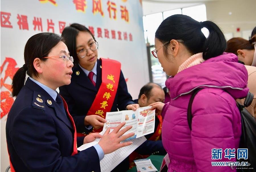 2019年2月25日,福州经济技术开发区税务局在福州马尾区举办“减税降费春风行动”宣讲活动,一名工作人员在活动现场为一家企业的出纳(右)讲解税收优惠政策。新华社记者魏培全摄
