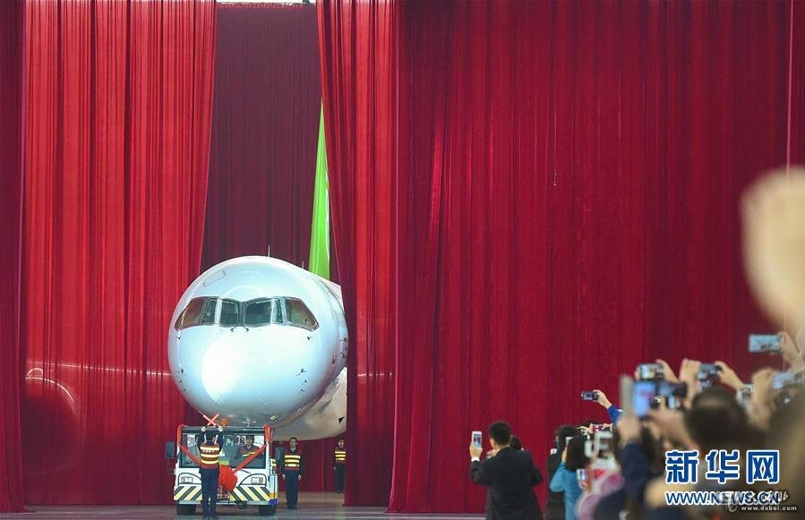 2015年11月2日,我国自主研制的C919大型客机首架机,在中国商飞公司总装制造中心浦东基地厂房内正式下线。新华社发(裴鑫摄)