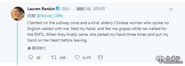 “我在地铁上晕倒了,然后一个好心的、上了年纪的中国(华裔)女性一直陪着我,她一句英语都不会说。在我们等待急救人员的时候,她握着我的手,还给我吃葡萄。当急救人员终于来了之后,她轻拍我的手三次,并把我的手放在她的心脏处(鼓励我),之后才离开。”