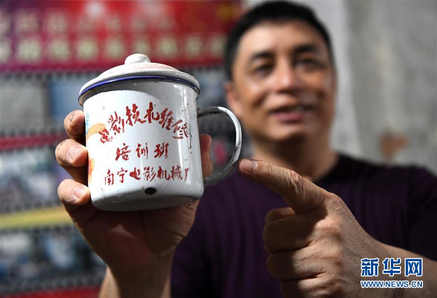 韦江在自家老屋里展示当年参加电影技术维修培训获得的纪念茶杯(3月5日摄)。 新华社记者 周华 摄