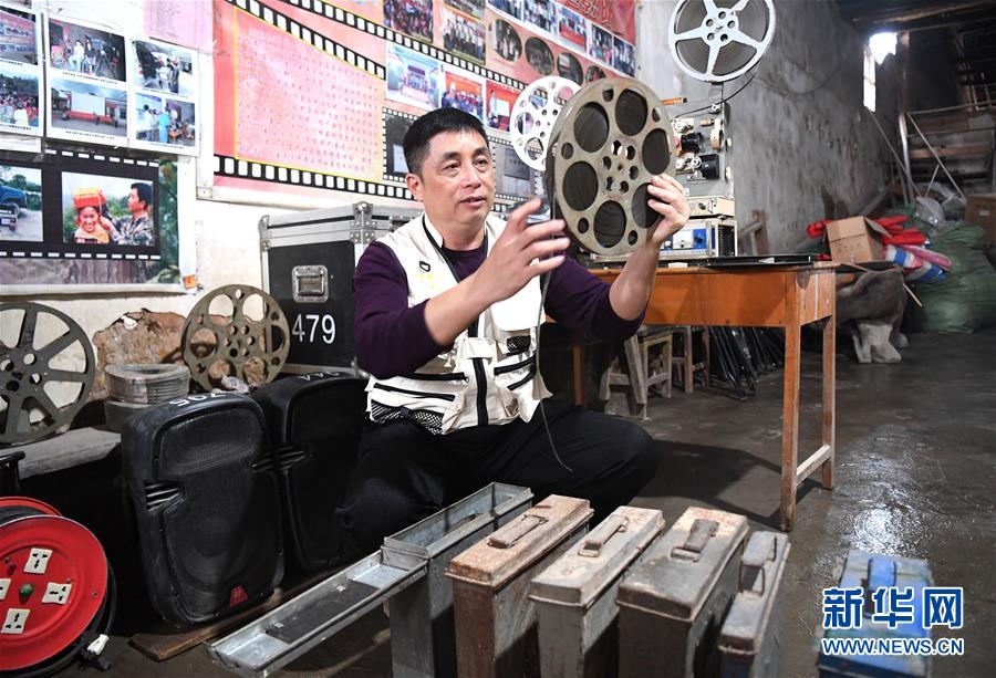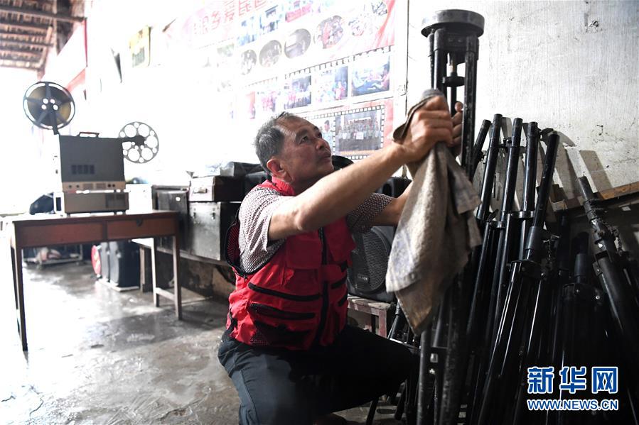 韦忠在自家老屋里擦拭用于放映电影的三脚架(3月5日摄)。 新华社记者 周华 摄