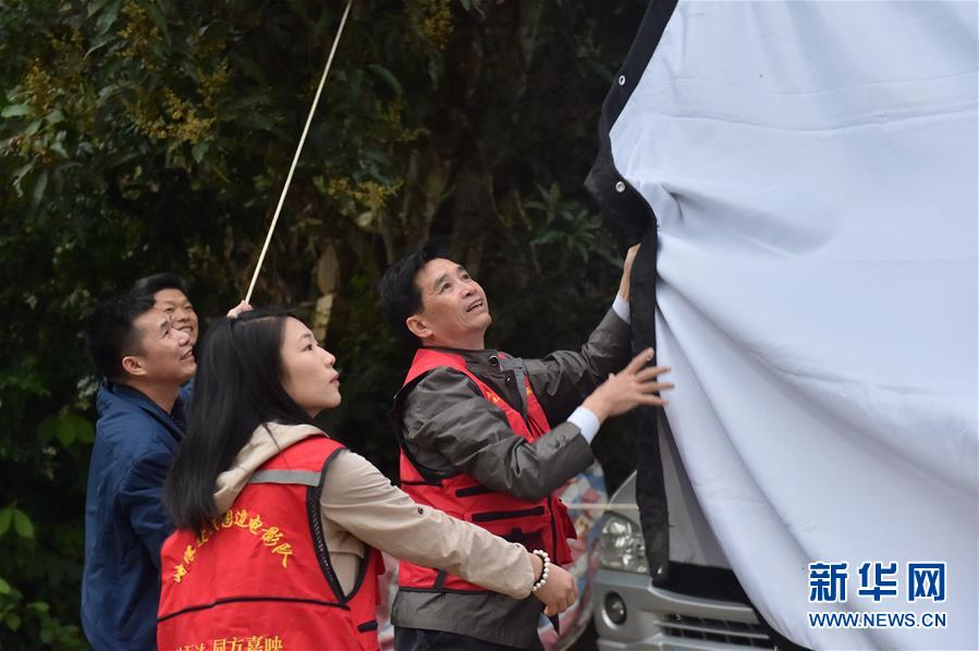 志愿者杨雪梅(右二)协助韦柯在宁明县堪爱村丈鸡屯悬挂银幕(3月6日摄)。 新华社记者 曹祎铭 摄