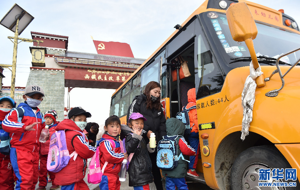 2018年3月27日,克松村的孩子们登上校车出发去幼儿园。新华社记者觉果摄