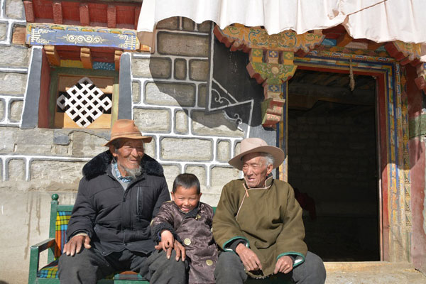 两位兄弟老人在自家院内与曾孙子一起晒太阳。记者扎西顿珠张斌摄