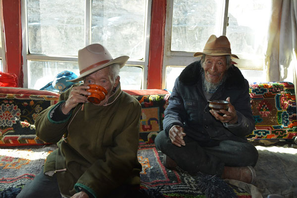 普布多吉和普布国杰两位老人正用早茶。记者扎西顿珠张斌摄