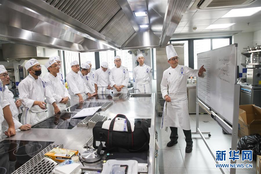 这是2018年10月17日, 来自法国的菲利普(右)在上海蓝带厨艺职业技能培训学校的教室内给学员们教授法式厨艺。 新华社记者 丁汀 摄
