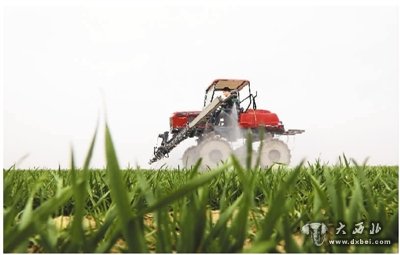 图为3月20日,山东省滨州市沾化区冯家镇农机手操作高地隙喷杆喷雾机为当地种粮大户张汝和的1800亩小麦进行喷防作业。