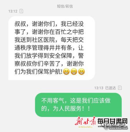 知情后,两名辅警迅速驾驶警车将该学生送往就近社区医院。在医院门口,由于门诊台阶很高,付洋洋索性背起这名同学走进诊疗室。同时让该同学用自己的电话联系家长。随后帮助这名同学挂号、做检查,待学生家长赶到医院后,付洋洋与同事便悄悄离去,继续投入到执勤巡逻工作中。当日下午1时12分,受助学生发来短信,对红古交警的热心帮助表示感谢。