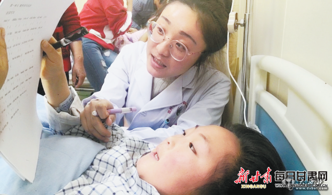 3月23日上午,兰州手足外科医院骨科一间病房里,传来一阵读书声。一名小女孩躺在病床上盯着试卷读着,旁边是一名身穿白大褂的女医生,两人正在读拼音填写词语。